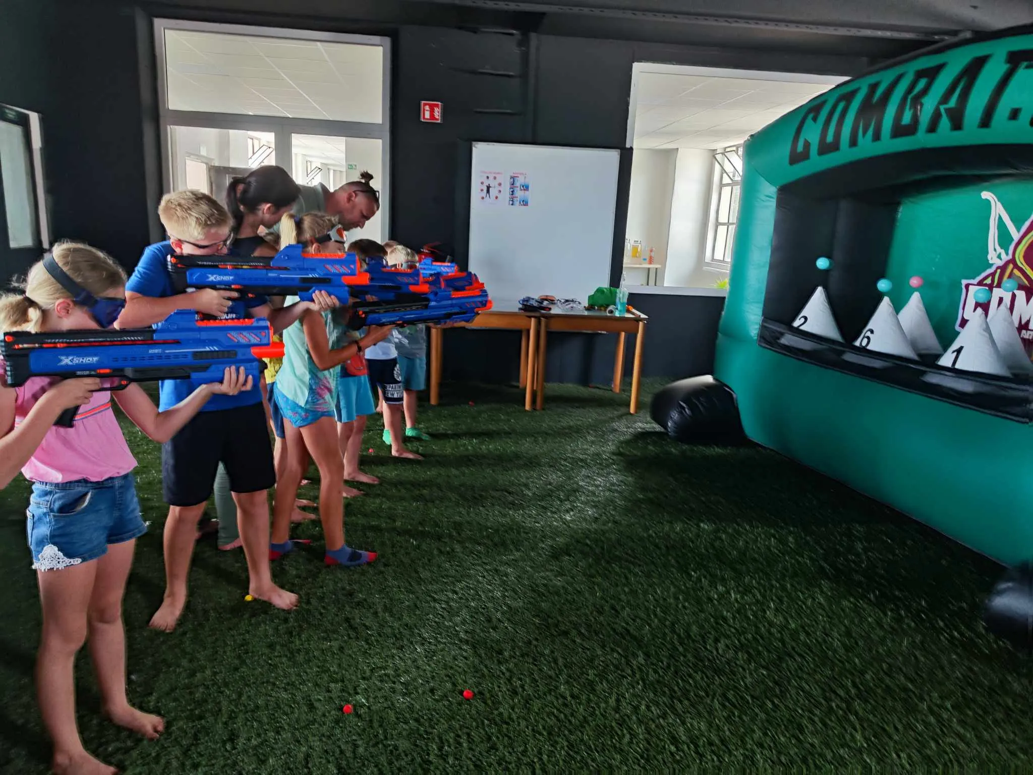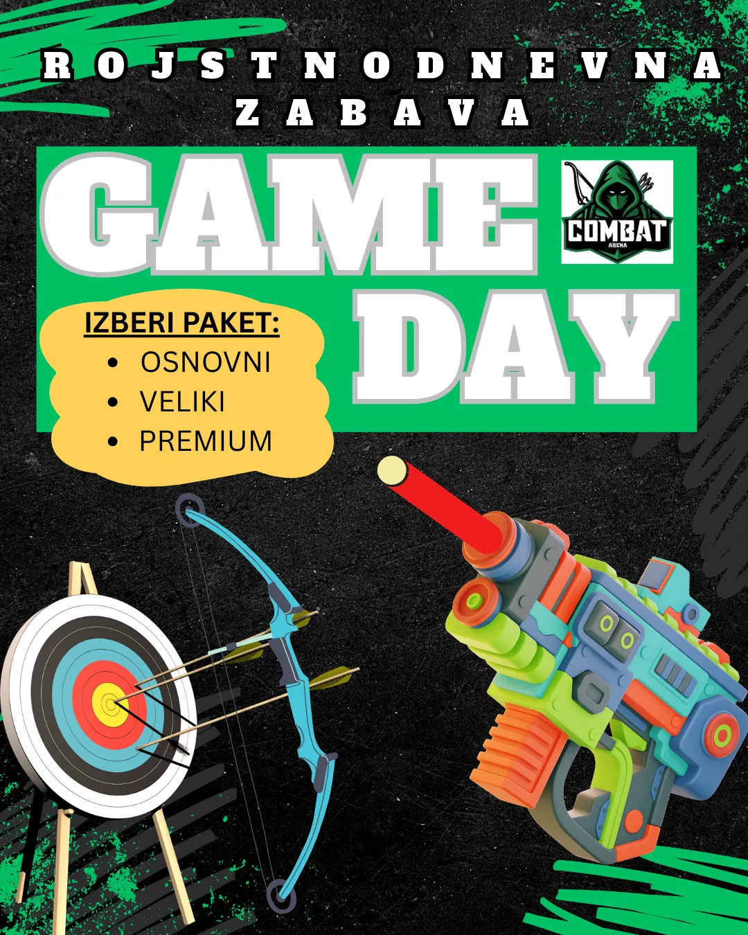Bi želeli, da je praznovanje vašega otroka nekoliko drugačno in nepozabno? Aktivno, razburljivo in zabavno? Potem bo Combat Arena zagotovo pravi kraj! Ekipa usposobljenih animatorjev bo otroke vodila skozi napeto lokostrelsko igro (Archery Tag in Mini Archery), kjer bodo preizkusili svoje spretnosti z lokom, pomerili pa se bodo tudi v tematskih izzivih z Nerf puškami. Po aktivnem doživetju pa vas vabimo v sobo za druženje, kjer se lahko otroci posladkajo s tortico in okrepčajo z drugimi dobrotami.