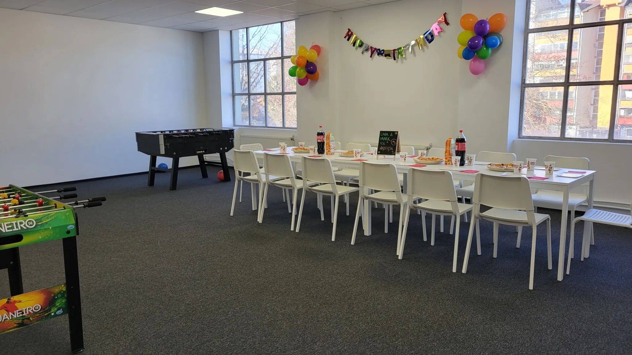Soba je okrašena, pripravljena s pogostitvijo, torto in prostorom za sproščeno slavje po igri.